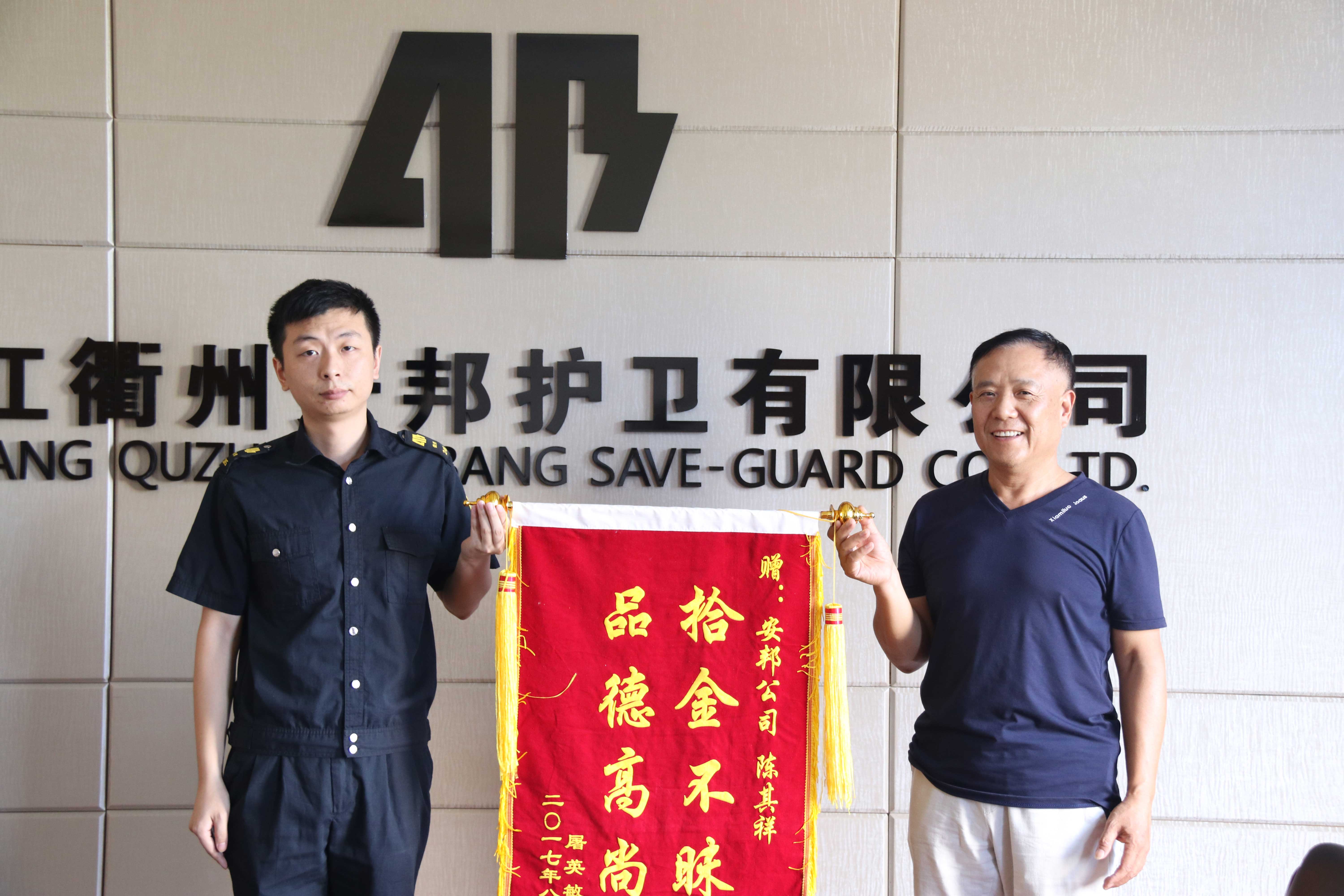 9月1日上午,一位老师傅手拿锦旗来到安邦护卫,满脸笑容的说:“我来给你们保安员陈其祥送锦旗了!”。