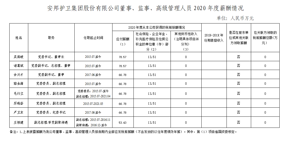 安邦护卫集团股份有限公司董事、监事、高级管理人员2020年度薪酬情况