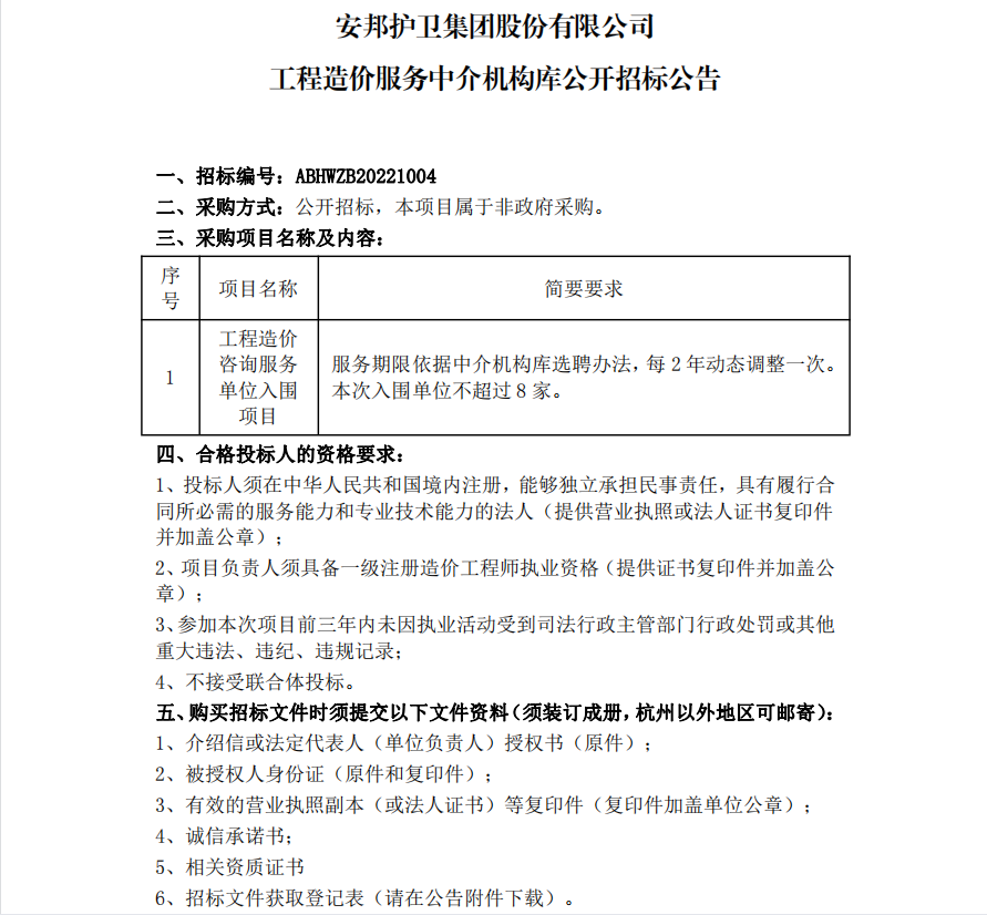 安邦护卫集团股份有限公司工程造价服务中介机构库公开招标公告
