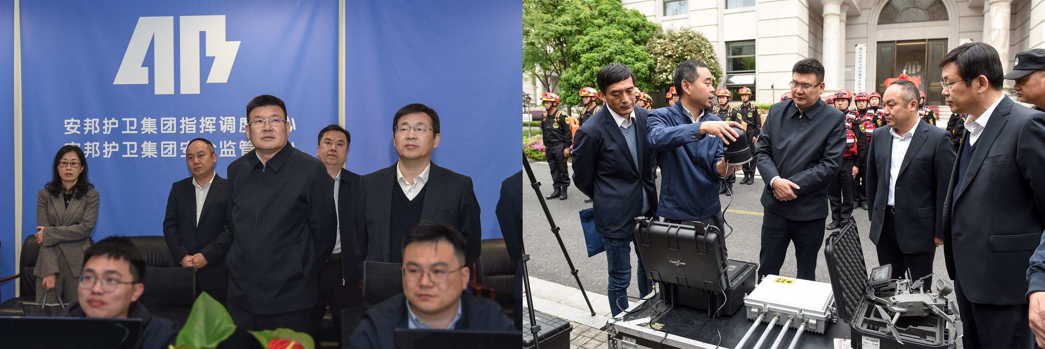 凌志峰一行实地考察了安邦护卫集团防汛抗旱应急救援队伍建设、装备配备、应急运输保障和应急指挥调度体系建设情况,观摩集团应急救援数字化合成突击队利用数字单兵、无人机执行侦查、搜救等科目实战演练,连线集团下属湖州、绍兴、衢州等三地子公司应急物资储备库、无人机服务队,以远程视频方式查看防汛抗旱应急物资储备、队伍实训等情况。