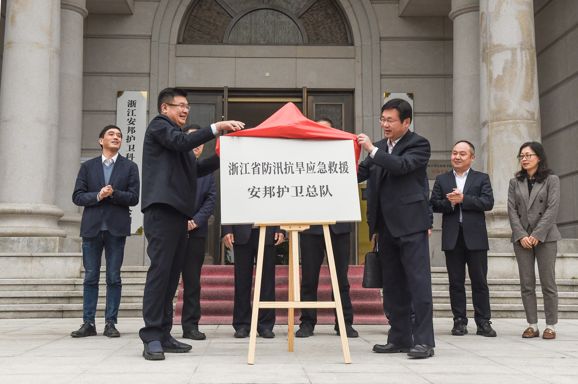 调研期间,凌志峰和吴高峻共同为浙江防汛抗旱应急救援安邦护卫总队进行了揭牌。