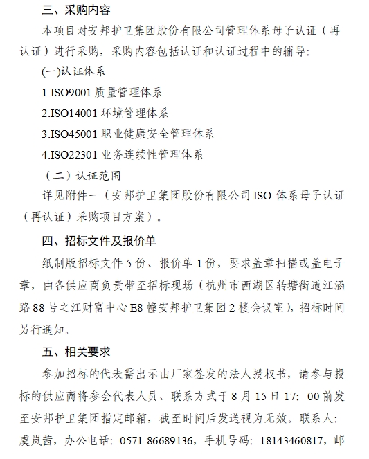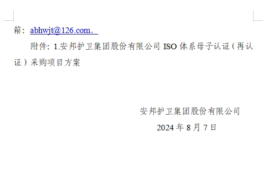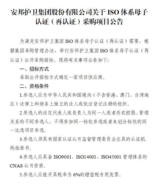 安邦护卫集团股份有限公司关于ISO体系母子认证(再认证)采购项目公告