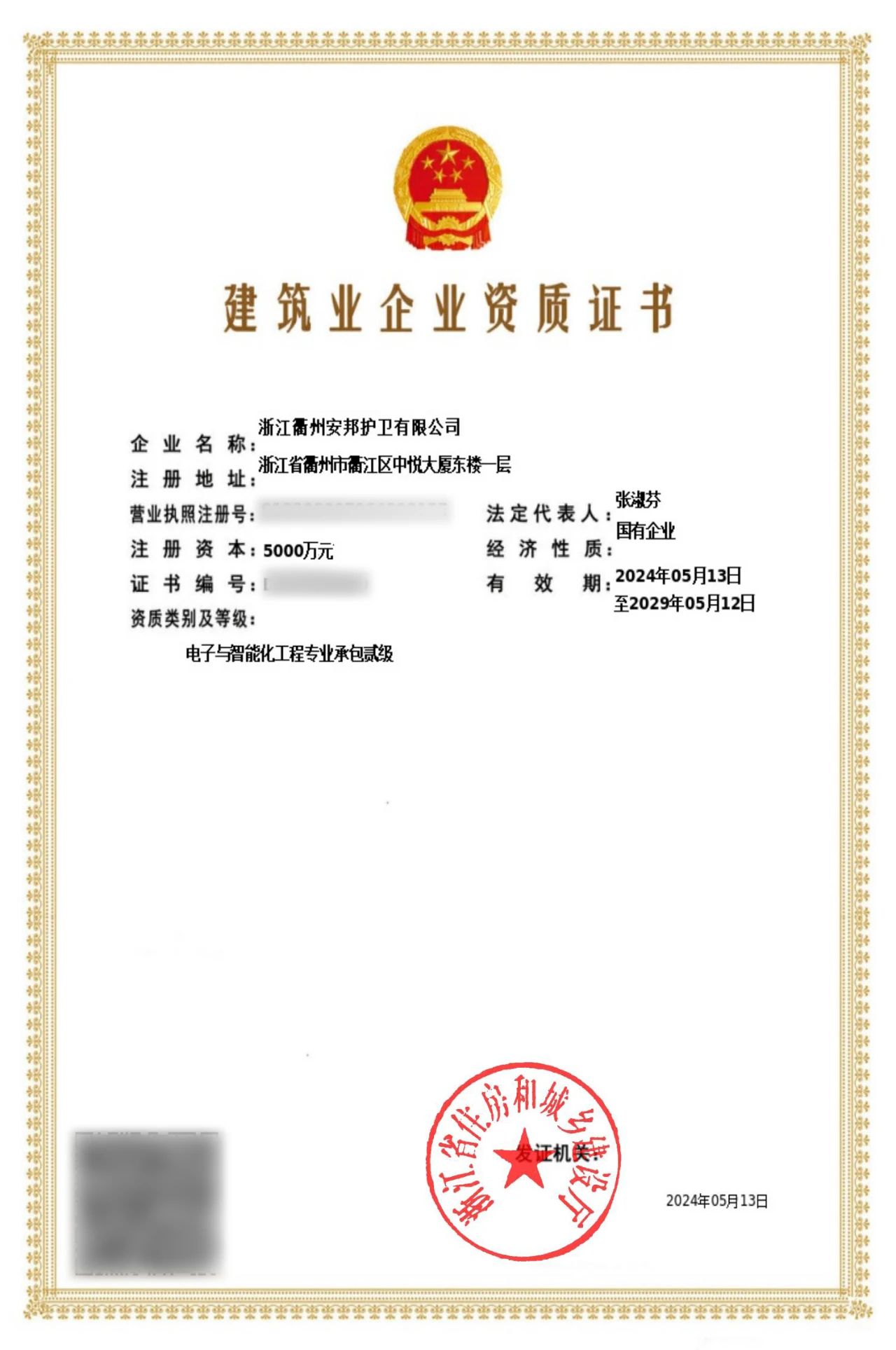 浙江衢州安邦护卫有限公司成功取得浙江省住房和城乡建设厅颁发的电子与智能化工程专业承包贰级资质。