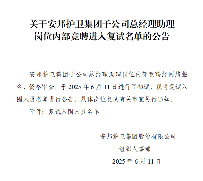 关于安邦护卫集团子公司总经理助理岗位内部竞聘进入复试名单的公告