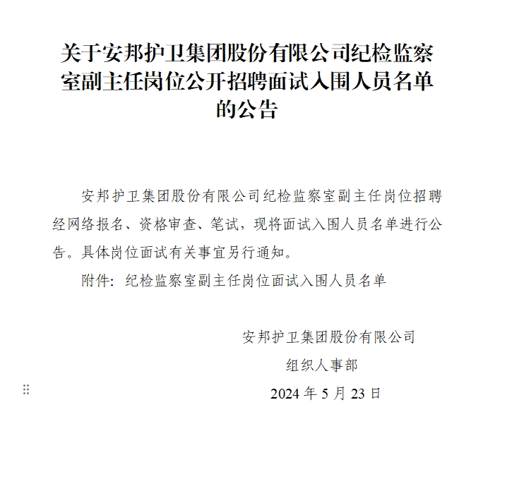 关于安邦护卫集团股份有限公司纪检监察室副主任岗位公开招聘面试入围人员名单的公告