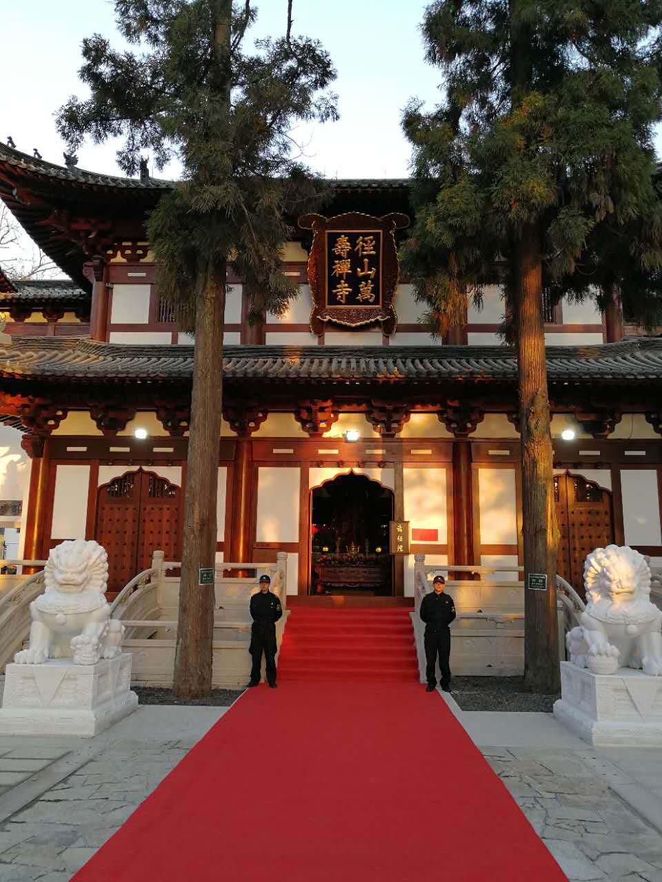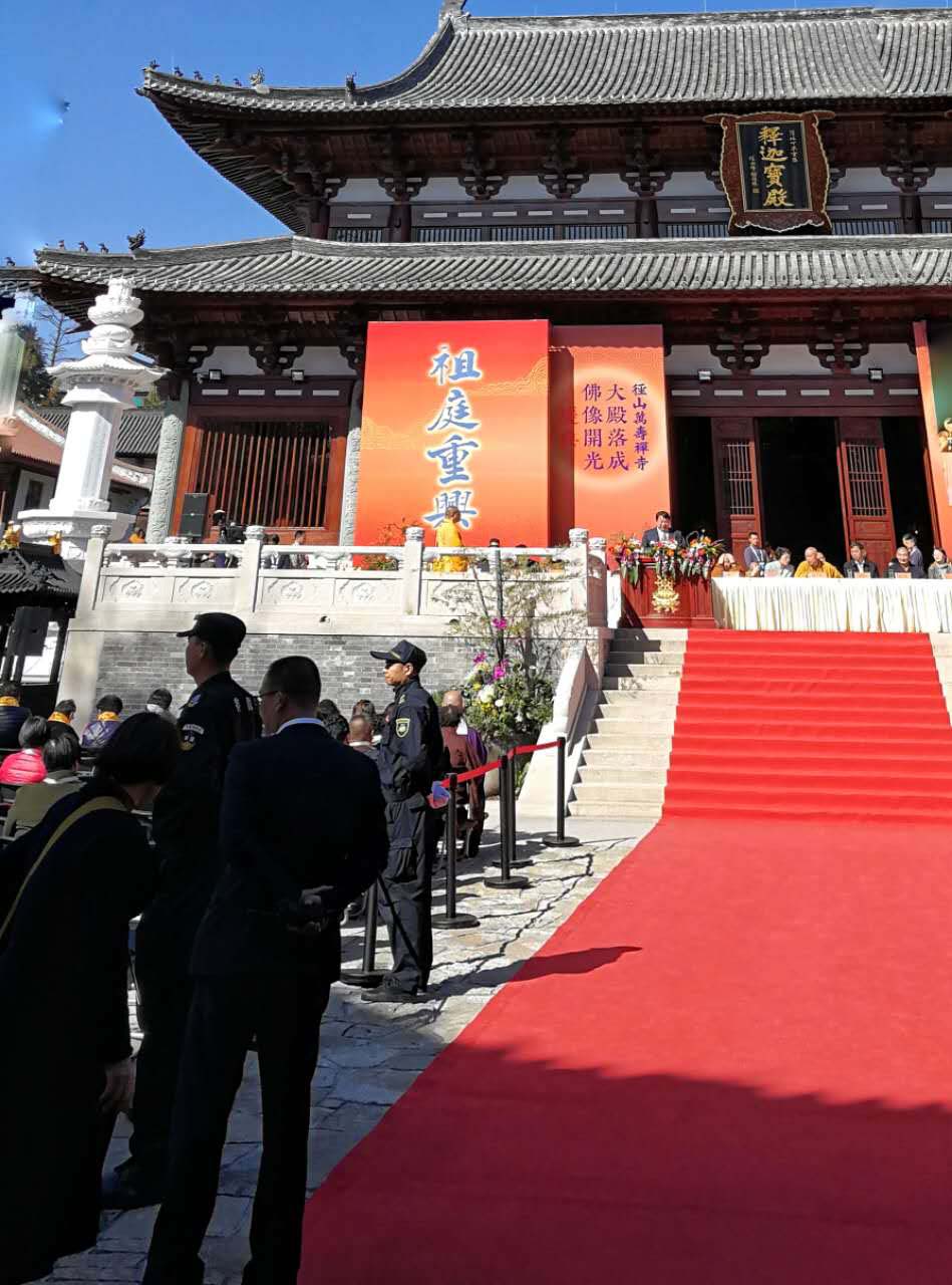 2017年11月9日,杭州径山禅寺举行了大殿落成佛像开光庆典活动。此次开光庆典活动是一场世界级的佛教盛事,有中央统战部、国家宗教局、中国佛教协会、浙江省政府、浙江省佛教协会、杭州市政府、杭州市佛教协会等单位有关领导以及来自各国的百位高德大僧、各界百名学者出席,其整体安保工作任务由安邦护卫集团承担。活动期间,百名安保工作人员在集团公司的坚强领导下,按照整体安保工作部署和要求,以超大的决心、超高的标准、超强的措施、超严的要求、超佳的状态,层层管控,筑牢安全防卫墙,整体安保工作圆满收官。