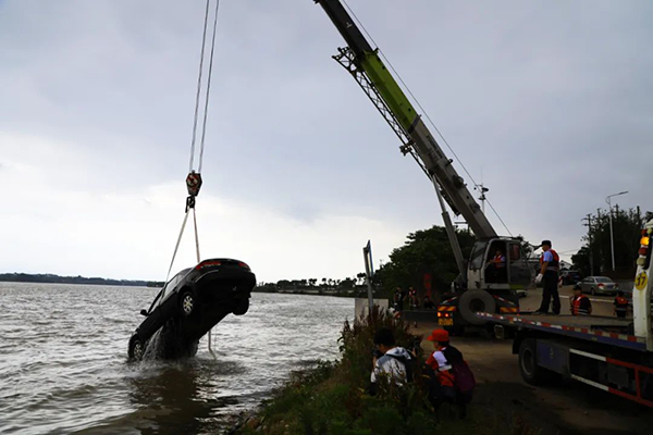 另一边,潜水员与吊车密切协同配合,按照要求数次下水作业后,将落水车辆成功固定于吊车钢索,顺利施救上岸,在小组的共同奋战下,“险情”得以顺利处置。