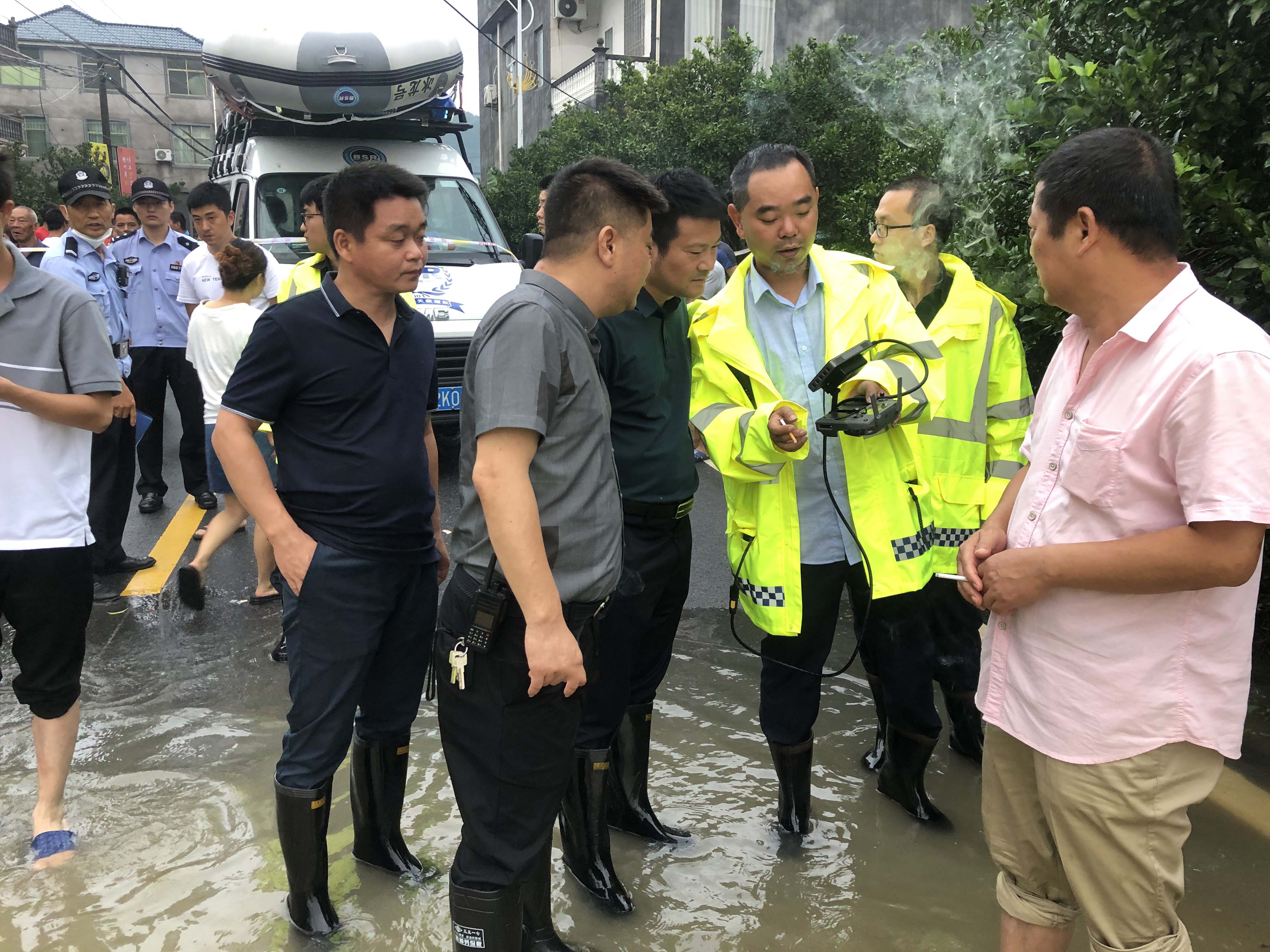 衢州安邦应急队迅速运用无人机及现场可视化指挥通讯设备协助航埠镇政府对受灾地区进行空中侦查,并将航拍和地面布控画面实时回传指挥中心。