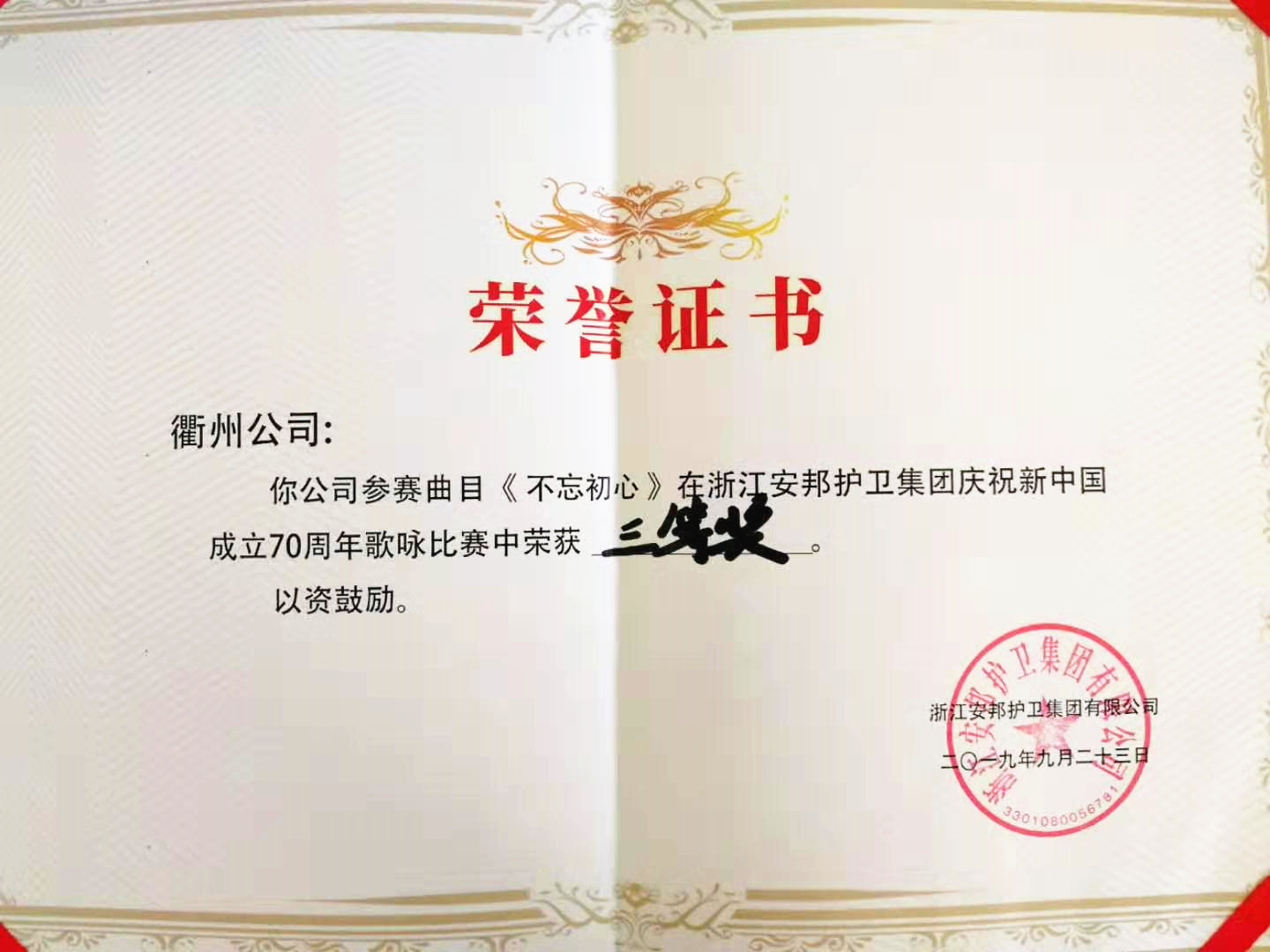 9月23日,浙江安邦护卫集团有限公司庆祝中华人民共和国成立70周年歌咏比赛在杭州拉开帷幕,集团公司总部和各子公司用歌声讴歌伟大新时代,唱响爱国铮铮誓言。